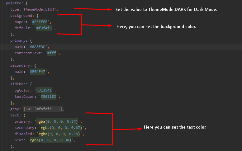 In the 'defaultConfig.js' file, there is a defaultTheme object, property named "**palette**" which contains some template related properties. In the palette object, there is a property named 'type', you need to set the value of type to '**ThemeMode.DARK**'. After that, you need to set the **background color** and **text color** present in the 'palette' property according to your choice. In case, you don't want to set the color, simply remove the '**background**' and '**text**' properties, then the template will take the **background** and **text** color according to Material UI default colors.